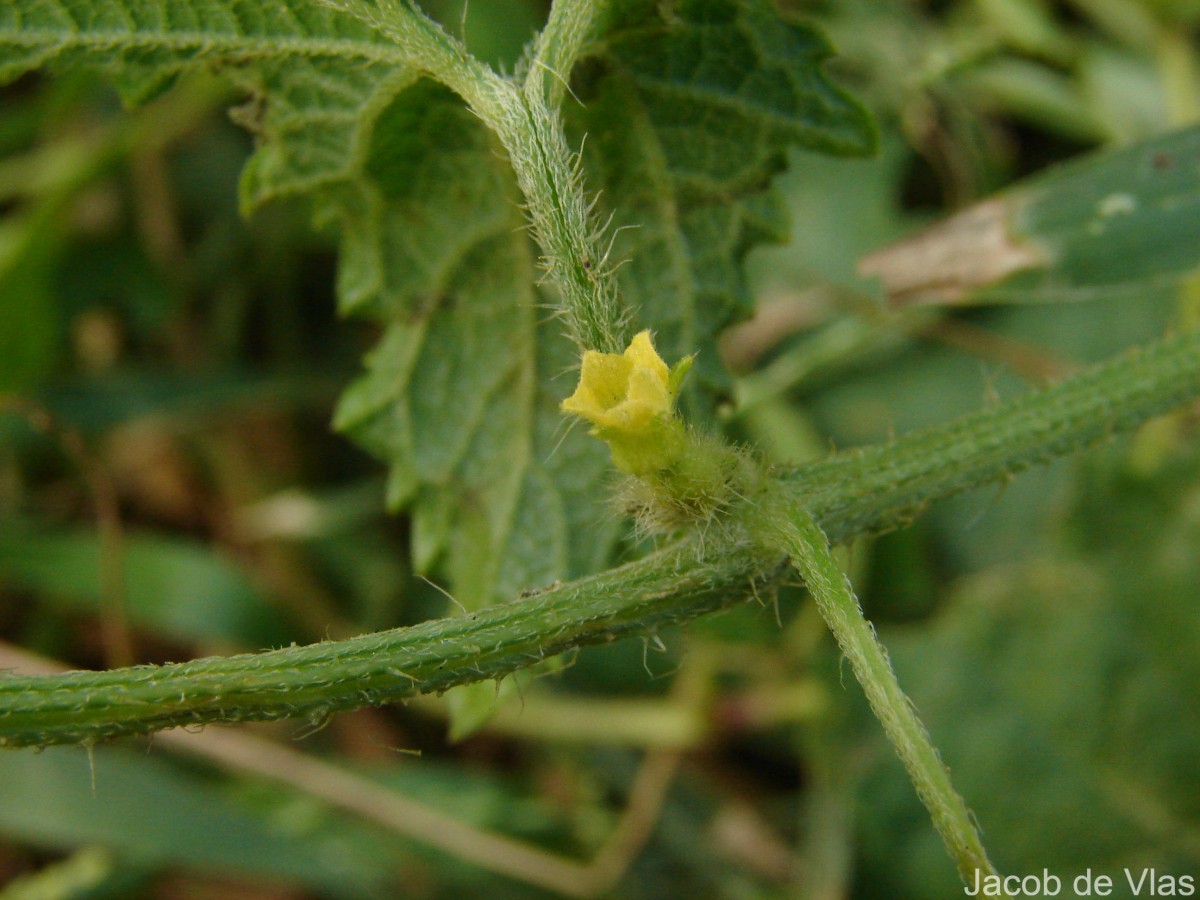Stem long, slender, much branched, strongly hispid with patent bristly hairs. Leaves dark green above, paler grey-green beneath, short to long lamina 3—11 x 3—10 cm, broadly triangular in outline, deeply cordate with wide sinuses, shortly to very deeply 5-lobed, margin shortly, irregularly dentate, shortly hispid beneath, especially on major veins, shortly hispid above, intermixed with long, white hairs to 2.5 mm long or not, or rarely subglabrous overall, 5-veined from base; petiole (0.5-)2-5.5(-9) cm, hispid Flowers yellow. Male flowers: calyx lobes 1 x 0.3 mm, triangular-subulate hirsute; corolla lobes 2.5 x 1.5 mm, connate for c. 1/3 of length from base, ovate obtuse, simple white hirsute without, short within; stamens 3, filaments short, c. 1 mm long. anthers 1,5 mm long. Female flowers: calyx lobes c. 2 x 0.5 mm, subulate, hirsute; corolla lobes 3.5 x 0.5 mm; ovary 3.5x 3 mm, ovoid ellipsoid, long hirsute, ovules many; style c. 1 mm long; stigma 3-lobed, lobes c. 1 mm long. Fruit (immature) c. 1.5 cm diameter, globose pale green with longitudinal cream stripes, ripening scarlet, simple hirsute, fruiting pedicel up to 3 mm long, stout. Seeds 3.5 x 2 mm, up to 25 or more. horizontal, closely arranged, flattened ovoid to trapezoid. (FOC)